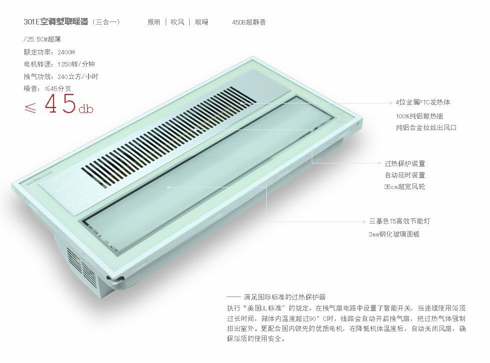 吊頂,已逐漸演變?yōu)榧烙^娛樂、享受放松和低碳健康等多種功能為一體整體空間,當今吊頂裝修從中獲益的不僅是視覺的享受,還有心靈的觸動。在這個轉變過程中,海創(chuàng)全能吊頂在功能、品質上都有長足的提高,營造出了高質量的生活品位,并且注重環(huán)保和節(jié)能。 于近期推出的海創(chuàng)新品HCD301E空調型取暖器,正是符合時代新特征的熱銷產品。 家庭的“小太陽” 4位金屬PTC發(fā)熱體:金屬PTC發(fā)熱材料啟動時,因開始溫度低,電阻值小,所以輸入電流較大,功率相對也大,從而使加熱器很快發(fā)熱。然后隨著溫度的升高(如風扇發(fā)生故障停轉),其電阻值大幅度增大,即以PTC(POSITIVETEMPERATURECOEFFCIENT)特性自動修正,使加熱器輸入功率降低,限制加熱器溫度升高。反之,則輸入功率增大。從而自動保持溫度基本不變。簡言之,快速加熱保持恒溫。讓您瞬間擁有屬于自己的“小太陽”。 午后的靜謐愜意 45DB超靜音設計,讓您在享受“日光”的溫暖時感受到猶如午后般的靜謐愜意,在平衡的感覺下使肉體和精神得到深度放松。 智能的高端設計 執(zhí)行“美國UL標準”的規(guī)定,在換氣扇電路中設置了智能開關,當連續(xù)使用浴頂過長時間,箱體內溫度超過90°C時,線路會自動開啟換氣扇,把過熱氣體強制排出室外。更配合國內領先的優(yōu)質電機,在降低機體溫度后,自動關閉風扇,確保浴頂的使用安全。 more+