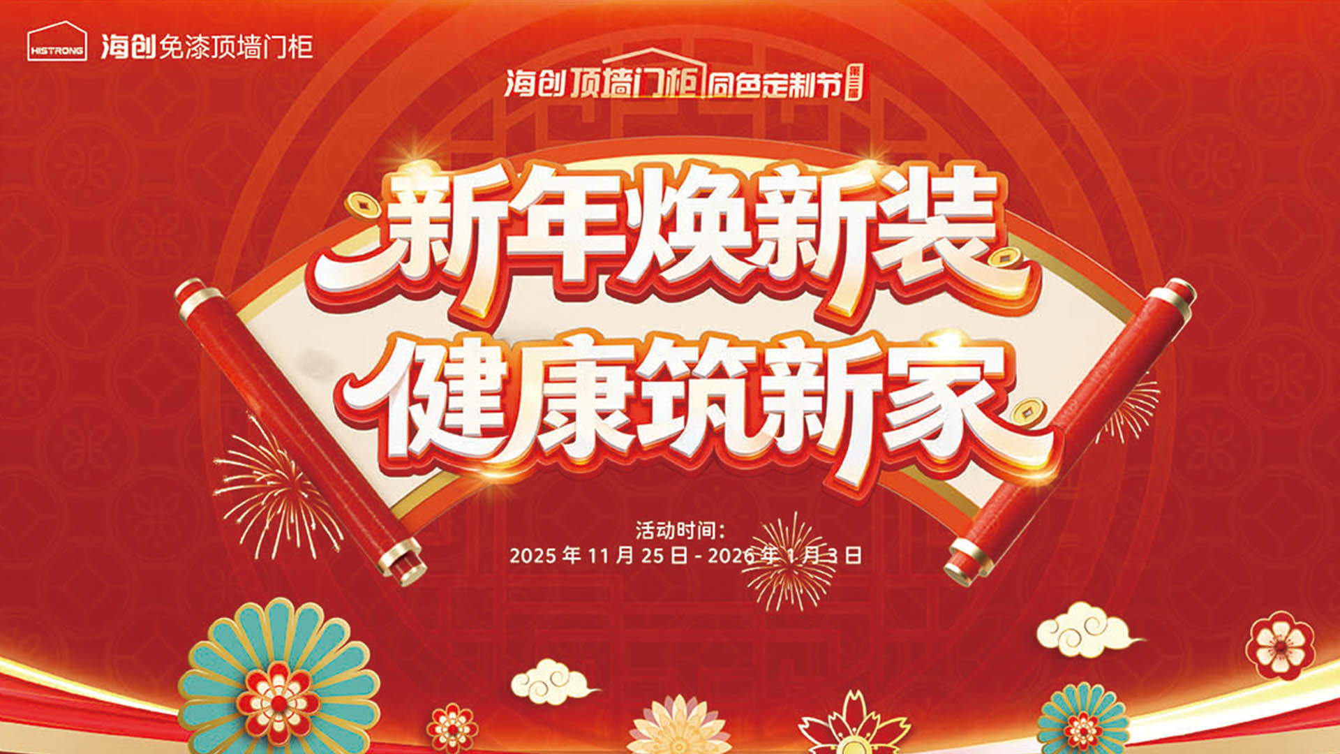 歲末將至新年煥新的愿望是否已在您心中生根發(fā)芽?想要一個更具品位、更顯格調(diào),同時兼顧健康環(huán)保的家?海創(chuàng)頂墻門柜同色定制節(jié)第三屆如約而至,新年煥新裝、健康筑新家,為您奉上一站式省心裝壕家解決方案,助您輕松實現(xiàn)新年換新家的夢想!活動時間2025年11月25日-2026年1月3日三大好禮活動專享進店有禮活動期間,親臨海創(chuàng)門店體驗咨詢,即可免費領取為您精心準備的“新年煥新福袋”一份。(數(shù)量有限,先到先得哦)老帶新 享好禮感謝老客戶們一直以來的支持與信賴!活動期間,老客戶介紹新客戶成功下單,新老客戶均可獲得我們送出的驚喜大禮包一份!省心裝 暢享壕家原價59600元省心裝壕家套餐,新年煥新價僅需29800元!直接省一半!限量3000套只留給懂生活的人主推套餐:29800省心裝壕家套餐海創(chuàng)頂墻門柜,秉承“健康筑新家”的理念,精選無醛環(huán)保板材,注重每一處細節(jié),為您打造一個健康、舒適、高品質(zhì)的家。全屋空間如何裝出高級感?9A 木健康墻板享新年專屬補貼輕松為您實現(xiàn)爆品系列木飾面大板 享半價優(yōu)惠全國統(tǒng)一指導價:299 元/㎡元旦特惠價:168 元/㎡起單背景想要一站式搞定?選購 8 ㎡易潔背景墻套餐輕輕一擦 光亮如新 涂抹不怕全國統(tǒng)一指導價:4880 元/套元旦特惠價:2980 元/套更有冬日溫暖洗浴衛(wèi)生間雙套餐可選1、舒享版4m²集成吊頂套餐簡約之美 高性價比首選衛(wèi)生間電器:F1/F3 風暖浴霸 (二選一)全國統(tǒng)一指導價: 1960 元/套元旦特惠價:980 元/套2、至尊版本4m²鋁蜂窩大板套餐線性藝術 科技與美學交融的智享衛(wèi)生間電器:T3 速暖空調(diào)全國統(tǒng)一指導價: 3980 元/套元旦特惠價:1980 元/套新年煥新裝,健康筑新家。海創(chuàng)頂墻門柜,為您筑就理想家。福利明日生效,感興趣的裝修朋友們趕快前往門店體驗選購吧,具體優(yōu)惠以海創(chuàng)門店為準.more+