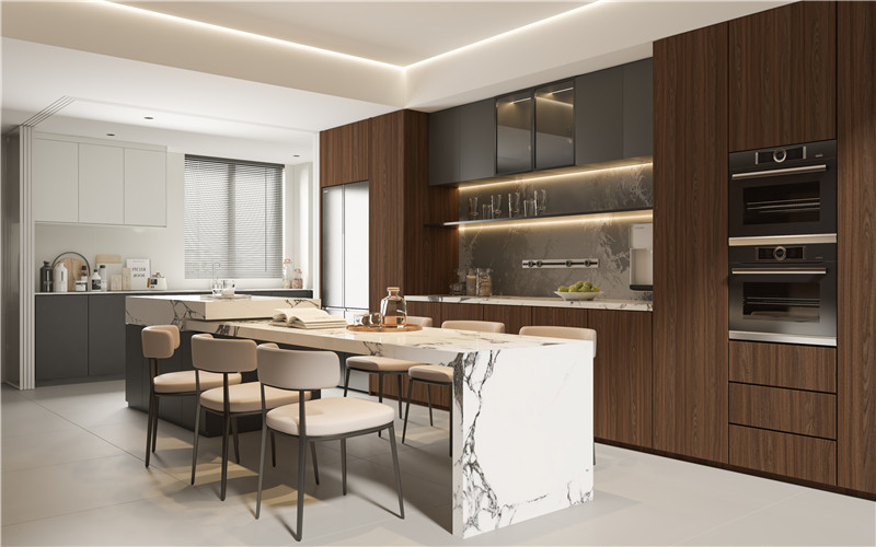 餐廚一體,是理想生活的全新提案。海創(chuàng)整家定制,通過頂、墻、門、柜的同色同紋一體化設(shè)計,讓美感與功能渾然天成,為您實(shí)現(xiàn)無論現(xiàn)代輕奢、精致意式、雅致新中式或溫暖原木風(fēng)的全風(fēng)格駕馭。我們以系統(tǒng)性思維規(guī)劃空間。例如,廚房選用抗油耐污的博格鋁蜂窩大板,與墻面、櫥柜保持和諧的白灰色調(diào),吊柜巧妙點(diǎn)綴,視覺連貫統(tǒng)一。此色調(diào)與設(shè)計語言可一直延伸至餐廳區(qū)域,形成大氣高端的整體感。布局上更具巧思,可將餐廳環(huán)繞于廚房之中,打造兼具中島與餐桌功能的核心區(qū),增強(qiáng)家人互動,讓空間利用率與收納效能最大化。從一板一色到整體格局,海創(chuàng)提供真正的省心整家定制。在這里,烹飪與歡聚無縫銜接,讓每一天都向陽而生。more +12月
