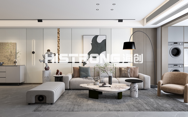 這套120㎡的居所,以侘寂美學為底色,通過頂墻門柜極致的黑白對比,勾勒出空間的清晰輪廓與深邃層次。黑,并非純粹的暗色,而是沉穩(wěn)的錨點;白,也非簡單的空曠,成為呼吸與光影的畫卷。客廳:定制的秩序感客廳的雙背景墻均采用頂天立地的定制柜體,以內(nèi)嵌形式消弭冗余。黑白柜面交織拼接,如同精心裝幀的書卷,在提供海量收納的同時,刻畫出立體而干凈的空間輪廓,奠定沉穩(wěn)大氣的基調(diào)。餐廚區(qū):圍合的溫度場采用開放式圍合布局,空間通透流暢。視線可毫無阻隔地延伸至廚房,讓家人備餐時的身影與笑語成為最動人的風景。一組深棕色的木質(zhì)吊柜恰到好處地點綴其間,其溫潤的質(zhì)感瞬間柔化了黑白的冷峻,為空間注入一絲暖意與高級感。玄關:延伸的巧思雖尺度精巧,卻通過延展式布局與半開放設計,巧妙化解局促。它既是歸家儀式感的起點,也高效承載了日常進出所需的收納,功能與形式達成微妙平衡。書房:專注的結(jié)界書房是黑白對比最為鮮明的場域。極致的色彩分割摒除一切紛擾,營造出冷靜、純粹的思考環(huán)境,有效提升專注力,讓精神在此迅速沉潛。臥室:織就的安寧雙臥室延續(xù)黑白主調(diào),并以深淺不同的棕色調(diào)和,交織出寧靜而舒適的睡眠氛圍。舍棄傳統(tǒng)飄窗布局,釋放出更多可利用空間,讓休憩體驗更為寬松自在。主衛(wèi):理性的升華主臥衛(wèi)生間采用同色系一體化設計,大理石墻面與蜂窩板無縫銜接。獨特的線性美學頂面設計,在純粹的黑白與利落的直線中,將功能與理性美學升華至新高度。在這里,生活被還原成一種素樸的儀式。每一處設計都服務于居住的本質(zhì)——在鮮明的對比中尋得平衡,在質(zhì)樸的材質(zhì)里觸摸溫度,最終刻畫出一個鮮明、從容、充滿理性與深情的生活現(xiàn)場。more +海創(chuàng)集成吊頂十大品牌,嘉興集成墻面招商集成墻面加盟中.海創(chuàng)環(huán)保集成墻面價格優(yōu)勢明顯,用科技與生活演繹全新的產(chǎn)品理念,創(chuàng)造集成墻面十大品牌
