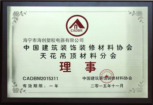 11月,中國建筑裝飾裝修材料協(xié)會天花吊頂材料分會正式授予海寧市海創(chuàng)塑膠電器有限公司天花吊頂材料分會理事單位殊榮。