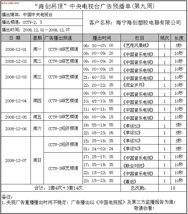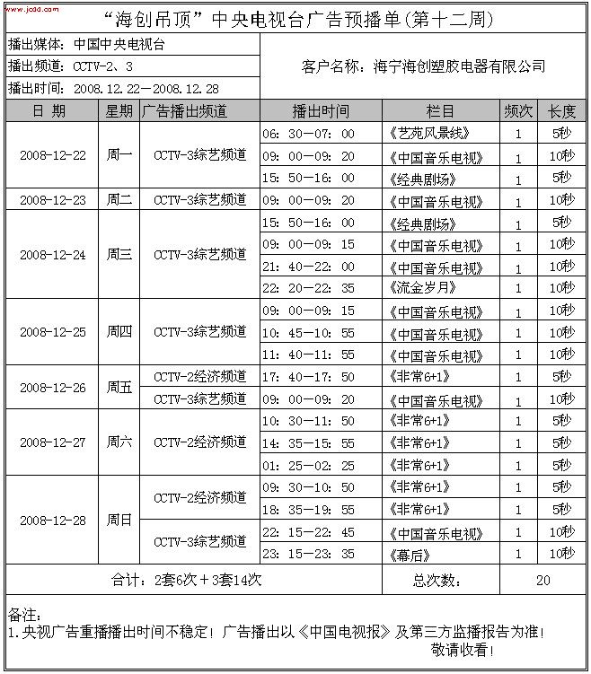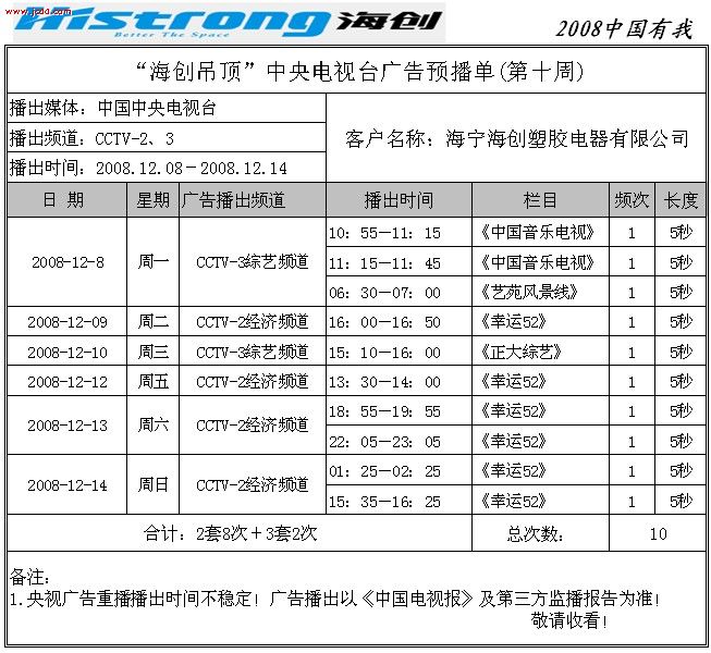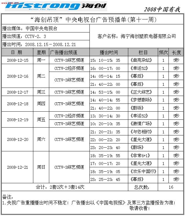 【最新資訊】“海創(chuàng)吊頂”中央電視臺廣告預播單(12月份)來源:海創(chuàng)集成吊頂十大品牌     發(fā)布時間:2008/9/28 13:43:17