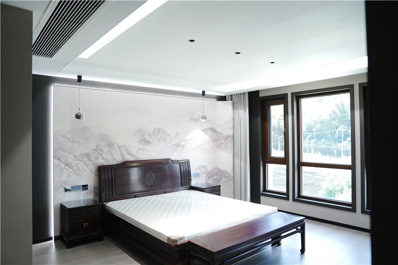 客廳一側(cè)的獨(dú)立茶室,是點(diǎn)睛之筆。海創(chuàng)9A級環(huán)保木格柵,以精湛工藝在頂部構(gòu)筑出起伏的“山墻”屋頂造型,木色溫潤,紋理自然。這不僅是對傳統(tǒng)建筑元素的現(xiàn)代演繹,更與窗外綿延山景形成巧妙呼應(yīng)。在此品茗,光影透過格柵灑落,仿佛置身山林懷抱,禪意悠遠(yuǎn)。