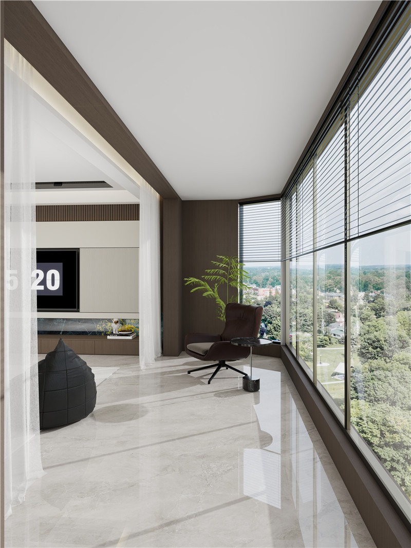 超大環(huán)繞式陽(yáng)臺(tái)將自然光與風(fēng)景無(wú)縫接入室內(nèi),與滿墻電視柜相呼應(yīng)。電視墻以藍(lán)金大理石紋局部點(diǎn)綴,輕奢質(zhì)感悄然流露,成為視覺(jué)焦點(diǎn)。