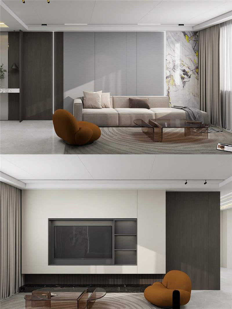 對于追求更簡約視覺的家庭,微復式電視墻是不二之選。通過材質(zhì)的碰撞與輕微的體塊落差,營造出簡約而不簡單的立體輪廓,無需過多裝飾,自成一景。
