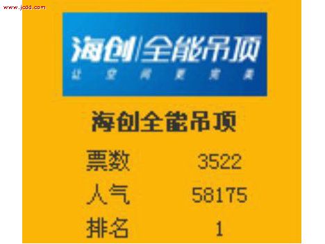 海創(chuàng)全能吊頂——憑借多年來的嚴(yán)守律己,對產(chǎn)品品質(zhì)的嚴(yán)格把關(guān),以“綠色環(huán)?!弊鳛楫a(chǎn)品的首要條件,一直受到廣大消費(fèi)群眾的關(guān)愛和選擇。在本次品選活動中,承蒙社會各界人士的信任與關(guān)心,使得“海寧市海創(chuàng)塑膠電器有限公司”一直遙遙領(lǐng)先于行業(yè)的先鋒位置,同時(shí)感謝于大家一直對“海創(chuàng)”的支持。