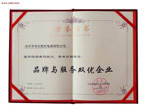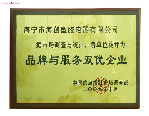 由“中國(guó)信息報(bào)社市場(chǎng)調(diào)查部”發(fā)起的2009年1~10月全國(guó)品牌與服務(wù)市場(chǎng)調(diào)查與統(tǒng)計(jì)活動(dòng)于10月19日評(píng)出 “品牌與服務(wù)雙優(yōu)企業(yè)”,海寧市海創(chuàng)電器有限公司榜上有名,成功獲得“品牌與服務(wù)雙優(yōu)企業(yè)”稱號(hào)(證書(shū)編號(hào):zgxxb0812216),這是繼去年取得“中國(guó)集成吊頂十大品牌”榮譽(yù)后的又一大殊榮。